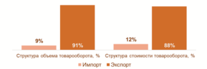 Наглядное сопоставление масштабов импорта и экспорта представлено на рисунке 1, где очевидна доминирующая роль экспортных поставок в общем объёме торговых операций. Подобная структура характерна для стран с развитой перерабатывающей промышленностью и ограниченной ёмкостью внутреннего рынка, когда основная часть произведённой продукции находит сбыт за рубежом.