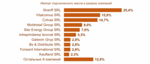 Компания Alionexagro SRL поставила 81 тонну на сумму 1,8 млн леев по цене 22 лея за литр, а компания Intreprinderea Isnovat SRL — 25 тонн на сумму 476 тыс. леев по цене 19 леев за литр. Обе компании составляют менее процента в структуре экспорта. На рисунке 5 наглядно показано абсолютное доминирование компании Floarea Soarelui SA, занимающей три четверти экспортного рынка.