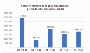 Общая стоимость экспорта пшеницы из РМ за первые четыре месяца сезона 2025–2026 гг. составила около 1,85 млрд леев. Однако пшеница стала единственной сельхозкультурой первой группы, цены на которую в этом году на молдавском рынке снизились, в то время как другие культуры выиграли от восстановления экспортных цен и объемов.