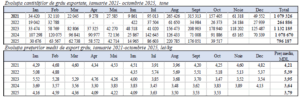В стоимостном выражении ежемесячная динамика экспортной цены на пшеницу в сезоне 2025–2026 годов была на удивление стабильной, т.е. без типичных колебаний, обычно сопровождающих месяцы «пикового» экспорта в сезоне. В июле средняя цена достигла максимума – 3,63 лея/кг, что ознаменовало более оптимистичное начало сезона, обусловленное первыми экспортными контрактами и небольшим первоначальным напряжением спроса. Впоследствии, в августе, цена снизилась до 3,50 лея/кг и практически не менялась в последующие месяцы, с небольшим ростом до 3,53 лея/кг в сентябре и октябре.