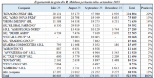 В рейтинге экспортеров пшеницы из Молдовы за период июль-октябрь 2025 года первое место занимает компания «RUSAGRO-PRIM» SRL, которая экспортировала в общей сложности 104,8 тыс. тонн пшеницы (20% от общего объема экспортных поставок страны). В первые три месяца сезона активность компании была стабильной, со значительными поставками в июле, августе и сентябре. Однако в октябре темпы ее поставок снизились.