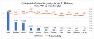 За первые четыре месяца нового маркетингового сезона, по сравнению с тем же периодом прошлого сезона экспорт молдавской пшеницы увеличился на 21% — 523 тыс. тонн против 432 тыс. тонн. В период с июля по октябрь 2025 года молдавская пшеница продавалась по средней цене всего 3,53 лея/кг, что немного ниже 3,57 лея/кг в 2024 году, но существенно ниже цены 3,63 лея/кг в 2023 году. Парадоксально, но средняя экспортная цена на пшеницу в первых месяцах нового сезона оказалась самой низкой за последние пять лет. Падение цен в 2025 году имеет более сложное объяснение, чем просто нисходящая динамика мирового рынка. В текущем сезоне решающую роль сыграла проблема низкого качества зерна и, отчасти, изменение географии его поставок.