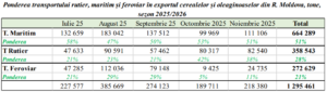 В Республике Молдова сезон 2025/26 начался довольно неплохо. В июле-сентябре доля железнодорожных перевозок в экспорте зерновых и масличных культур превзошла ожидания: достигла 21% в июле и увеличилась до 29% в августе и сентябре. Это значительно выше уровня предыдущих лет, когда железнодорожные перевозки редко превышали 12–15%. Таким образом, при конкурентоспособных тарифах железная дорога и в РМ может стать реальным инструментом оптимизации издержек и поддержки более высокого уровня закупочных цен для фермеров.