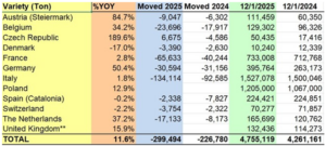В Испании запасы остались стабильными на уровне 224 421 тонны, немного снизившись с 224 851 тонны, в то время как в Швейцарии было зафиксировано 70 277 тонн, что меньше, чем 71 857 тонн. В Дании запасы сократились до 10 240 тонн по сравнению с 12 339 тоннами. В Нидерландах было зарегистрировано 165 699 тонн, что больше, чем 120 762 тонны, а в Великобритании — 132 436 тонн по сравнению со 114 273 тоннами в прошлом сезоне.